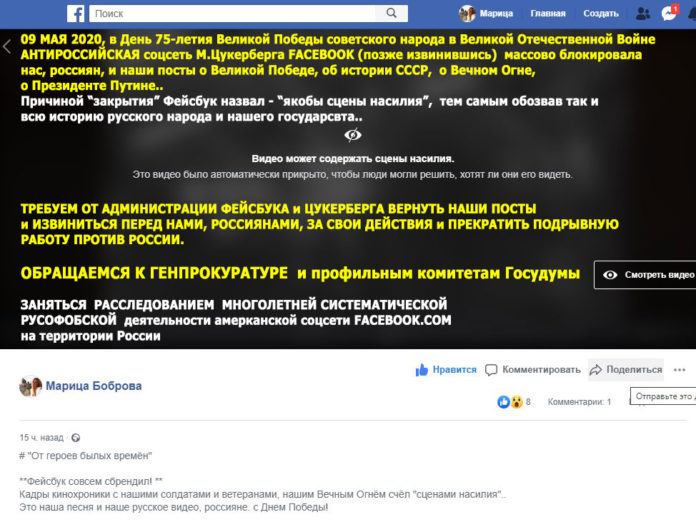 По факту «закрытия видимости» вчера, 09 мая 2020, русофобской соцсетью Facebook нашего русского видео о Великой Победе советского народа в Великой Отечественной войне, о советских ветеранах, о Вечном Огне и о России направлено требование в Техподдержку FB немедленно восстановить наш видеопост и принести извинения за антироссийские действия и оскорбление нас, россиян, и нашей истории подобными провокационными деяниями.